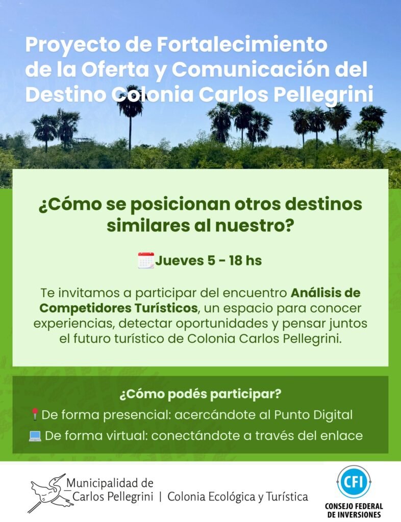 En el marco del Proyecto de Fortalecimiento de la Oferta y la Comunicación del Destino Colonia Carlos Pellegrini, se realizará un nuevo encuentro abierto de Análisis de Competidores Turísticos, orientado a reflexionar sobre el contexto actual del turismo de naturaleza y las oportunidades para el desarrollo local.